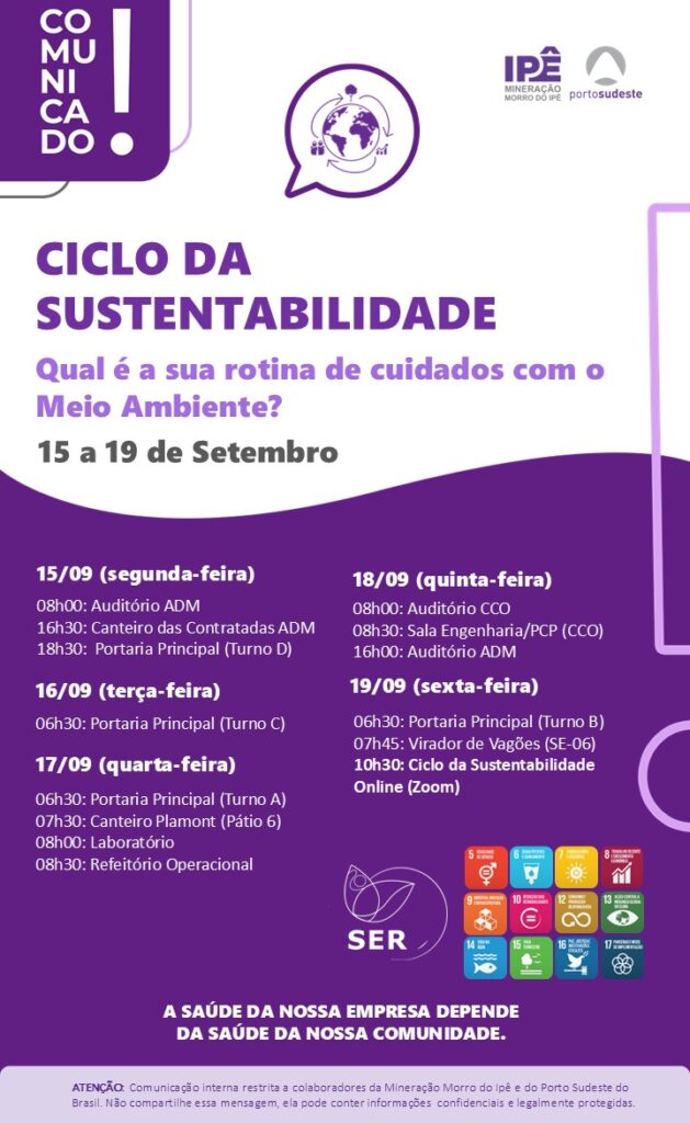 Ciclo da Sustentabilidade – 15 a 19 de Setembro – Participe! setembro 11, 2025 Por adminpedro 1Curtir Você também vai gostar Ciclo de Diálogo Social Porto Sudeste – 6 a 10 de novembro – Participe! Ciclo da Sustentabilidade – 15 a 19 de julho – Participe! Ciclo de Diálogos Sociais: de 22 a 30 de abril – Participe!